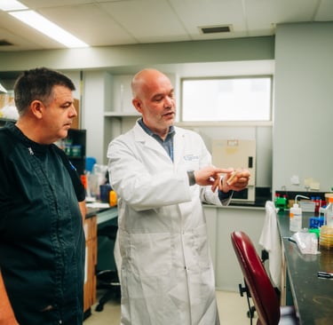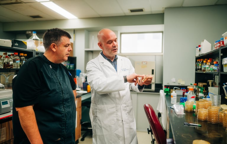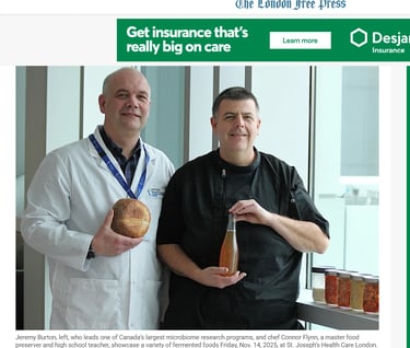Jeremy Burton, left, who leads one of Canada’s largest microbiome research programs, and chef Connor Flynn, a master food preserver and high school teacher, showcase a variety of fermented foods Friday, Nov. 14, 2025, at St. Joseph’s Health Care London. (Dale Carruthers/The London Free Press)
